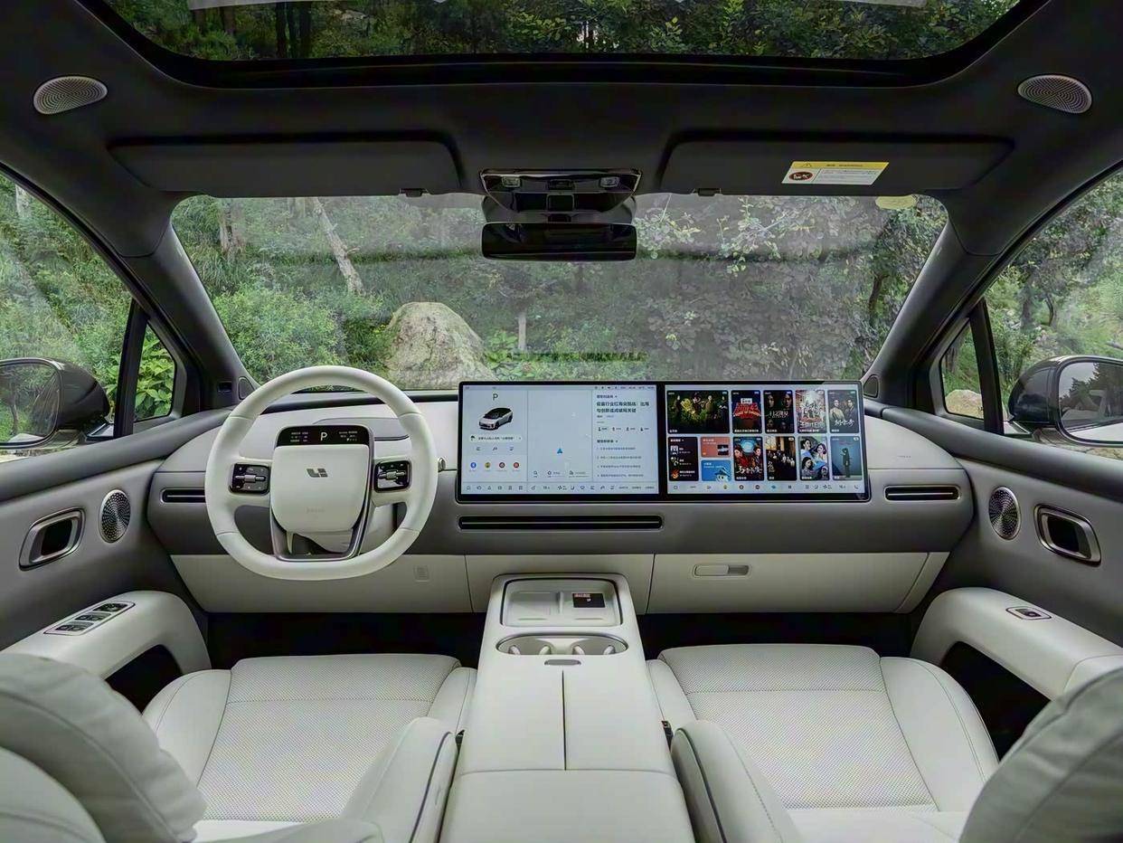 内饰方面,理想已经形成了自己的风格,旗下所有车型都差不多,理想i6配备了两块15.7英寸的3K屏幕组成中控/副驾“双联屏”,它没有配备液晶仪表盘,方向盘上有块4.82英寸的小屏幕,还配有16.3英寸的HUD投屏,以取代仪表盘。