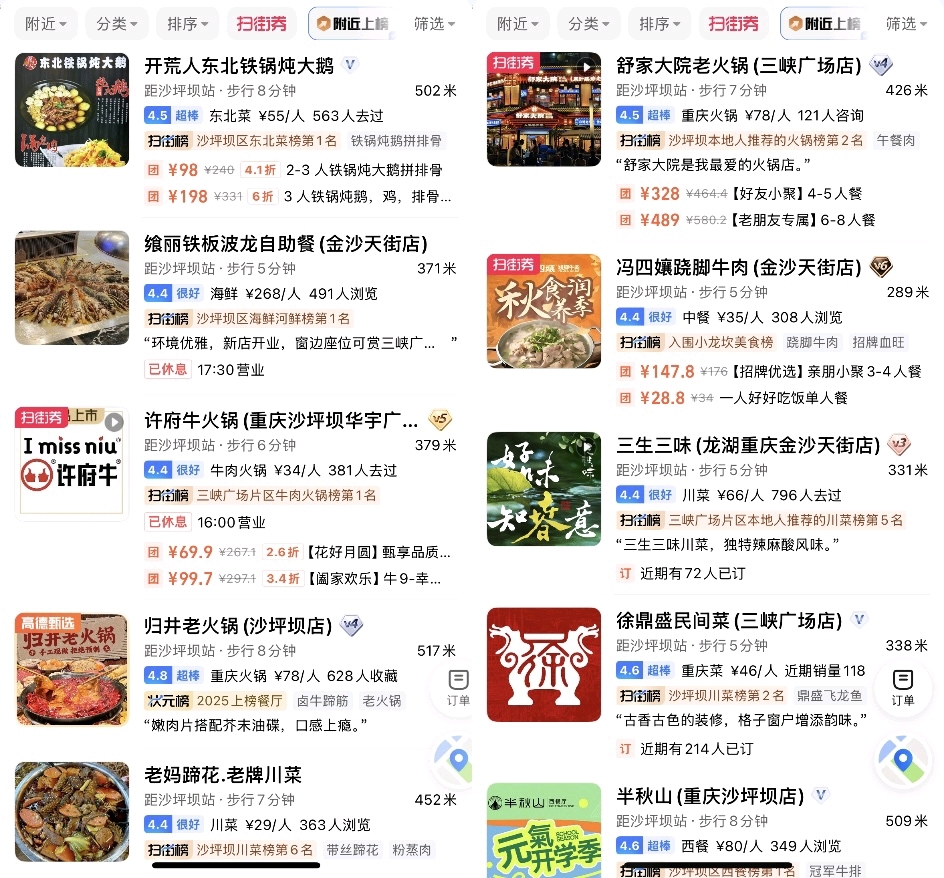 重庆的魔幻地形和热辣鲜香对于很多游客来说都极具吸引力,从高德扫街榜可以看到,作为“十大吃货友好高铁站”之一的重庆沙坪坝高铁站周边有多家高分餐厅,涵盖重庆火锅、跷脚牛肉、东北菜、川菜、西餐、日料等各种美食类型。
