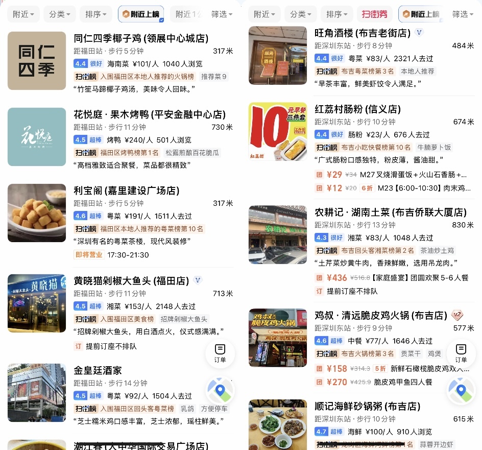 在“十大吃货友好高铁站”占据两席位置的深圳市,国庆期间预计到发旅客864.5万人次,不同于重庆带来的味觉刺激,游客可以通过高德扫街榜在深圳福田站、深圳东站附近吃到地道的粤式早茶、清远脆皮鸡、海鲜砂锅粥等主打清淡鲜香的美食。
